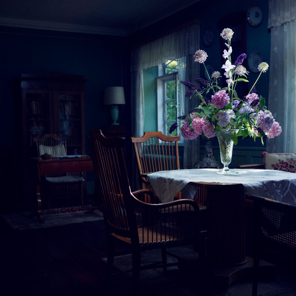 ‘She took the whole garden with her into the house,’ says Olsen, Rungstedlund’s floral director since 1996. A former jazz-ballet instructor and a mother of three, she had worked for several years at the café on the 40-acre Rungstedlund property, which, as in Blixen’s day, is a sustainable landscape and bird sanctuary. A creative position eventually came open. ‘I held up my hand,’ she recalls, ‘and said, “I’ll do it.”’ This despite not knowing a great deal about flowers (‘They were a hobby of mine’) and nothing about the baroness’s eloquent, eccentric way with them, so different from the historically well-mannered national norm. ‘In the beginning, I was a little confused, so I realised I had to figure out how to do this,’ Olsen remembers. ‘I started making drawings of Karen Blixen’s arrangements and tried to copy them. Then it began to make sense. She didn’t like compact arrangements – she liked them wild and open, like explosions.’ Ring a Danish florist today and request something i Blixen-stilen, and they know precisely what is expected.