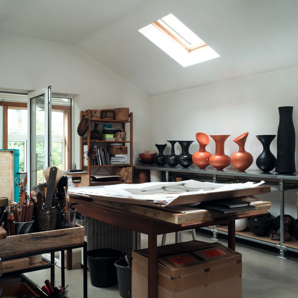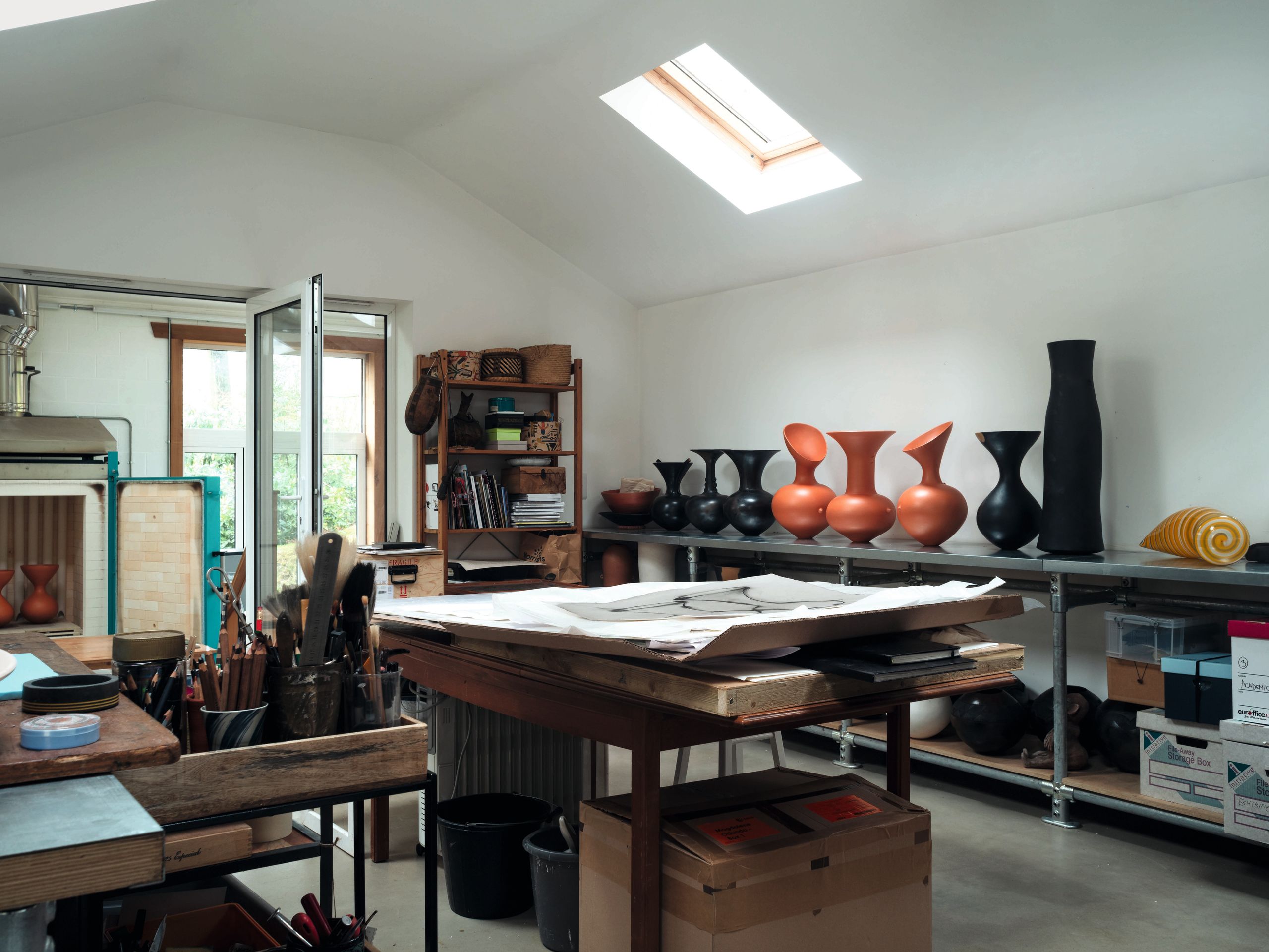 The final studio is the business end, home to a gas and an electric kiln, great bins of red clay, sacks of wood shavings and wiped-down tables of tools. After almost 40 years, she says, the technical aspect of making is intuitive and cumulative, a combination of ‘acquired knowledge and the knowledge that continues to be acquired. It’s to do with the forms and getting the finishes that complement the forms.’