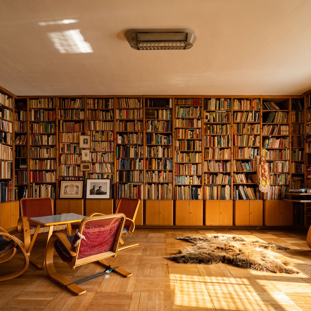 The architect manifested his mastery above all in the interior. On the ground floor a spacious living room is connected to the library via sliding doors. Thousands of volumes are stored in built-in shelves with a sophisticated system for easy repositioning. This is just one of many ingenious interior solutions developed specifically for the interiors. They also include a range of seating, which Plesník realised in collaboration with furniture designer Miroslav Navrátil. Aerodynamic cantilevered bentwood armchairs were inspired by the work of Alvar Aalto. Numerous versions of chairs, coffee tables and lamps were designed according to similar principles.