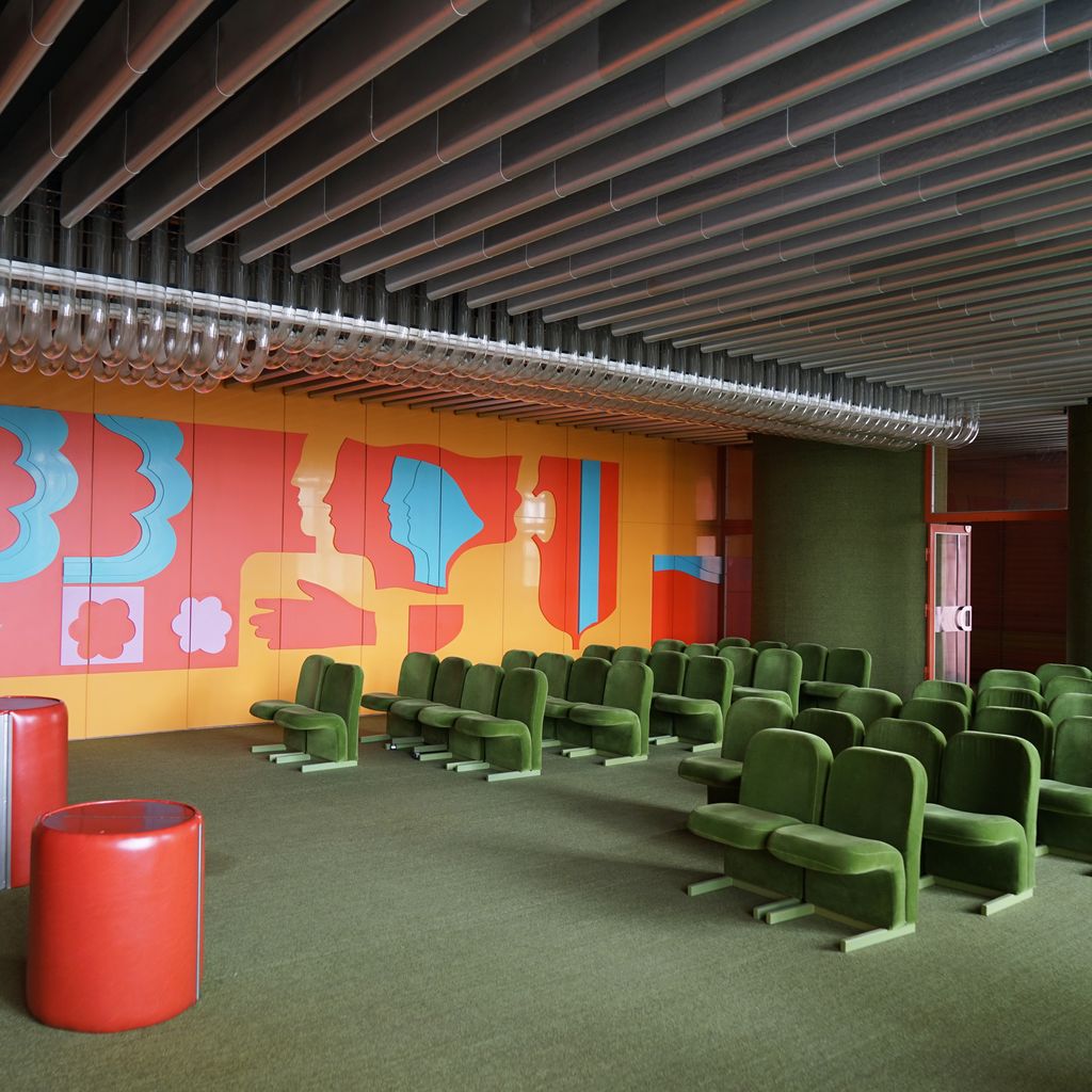 Together, we visited three of the most singular halls. The first one is located in the small village of Soporňa. It was constructed in 1980, with its interiors masterminded by architects Ivan Petelen and Rastislav Janák. The green-and-orange scheme combining furniture and built-in elements create a colourful, Pop-infused space, complete with bespoke chairs reminiscent of designs by Verner Panton or Pierre Paulin. As is the case across many of these wedding halls, the one in Soporňa was designed down to the smallest details: from artist Stefan Bobota’s eye-catching wall relief layering faces in profile, down to the built-in curved benches and the intricate glass lights, everything here has clearly been meticulously considered.