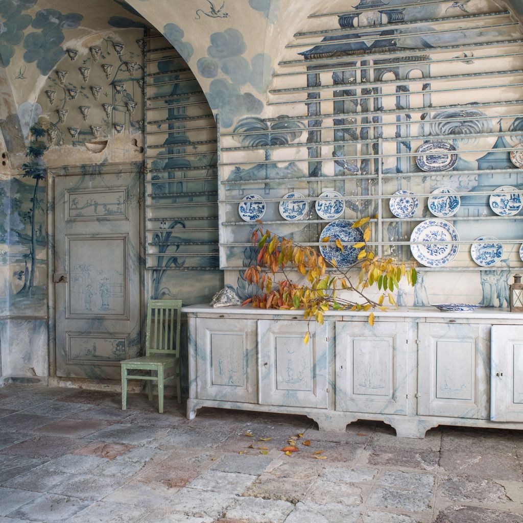 Today the kitchen is an empty shell, faded yet strangely poetic. The collection was sold off when Tureholm changed hands in 1917, revealing the playful painted décor that had previously been hidden behind china plates. The room presents something of a mystery. Was Count Thure – a military man, after all – really responsible for its charming design? Even with the aid of a well-travelled architect such as Hårleman, it seems unlikely to me.